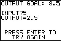 In the last problem, students will use the program MACHINE which acts like a function machine. When they enter an input value, it will return the output value. They are to determine the input value for the goal output and the mystery function.