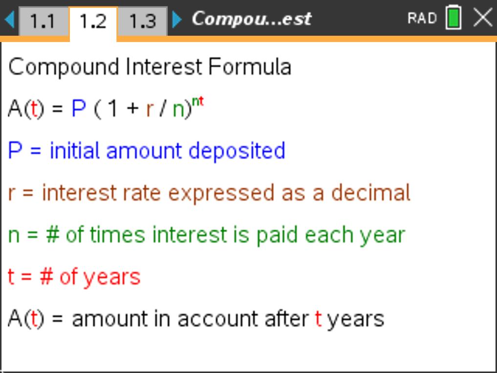 This lesson involves exploring the formula for compound interest as a function of the initial deposit, interest rate and the number of pay periods per year.
